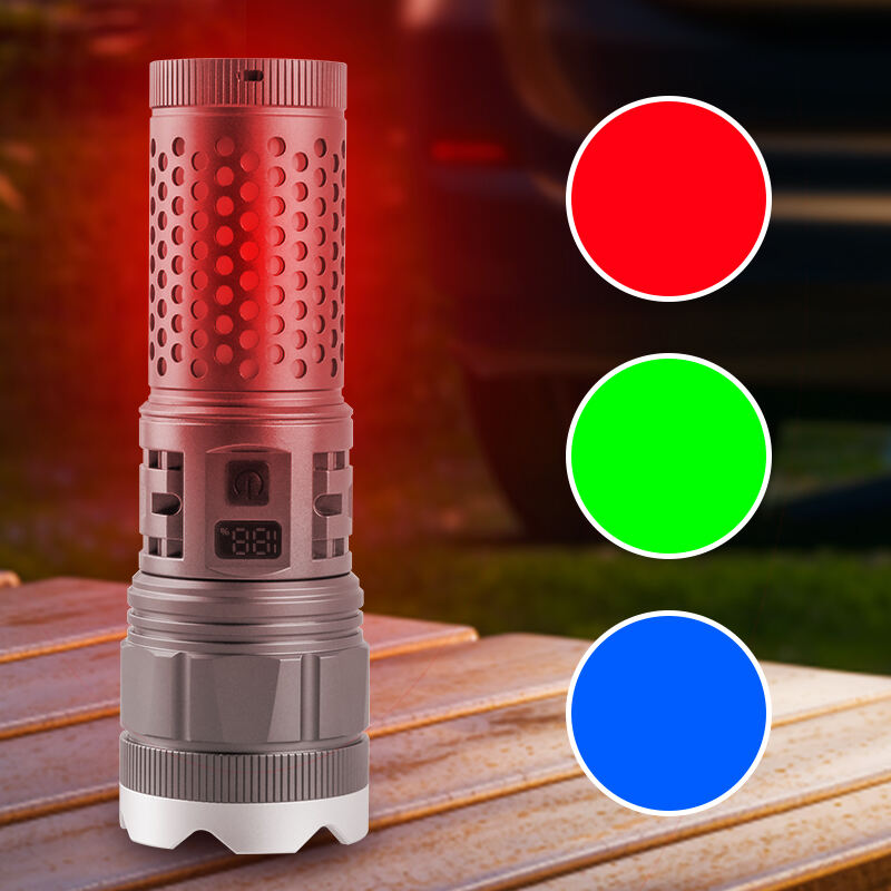 يجمع هذا المصباح المتعدد الاستخدامات بين ضوء أبيض فائق السطوع وأوضاع حمراء وخضراء وزرقاء للاستخدامات التكتيكية والطوارئ والأنشطة الخارجية. ويتميز بتركيز قابل للضبط، وطاقة قابلة لإعادة الشحن عبر منفذ USB، ومؤشر رقمي واضح لحالة البطارية، مما يوفر أداءً موثوقًا به للتخييم والأمن والاستخدام الاحترافي.