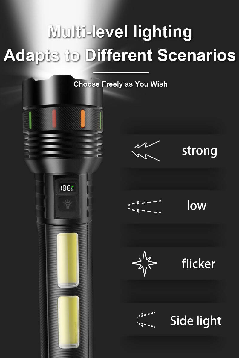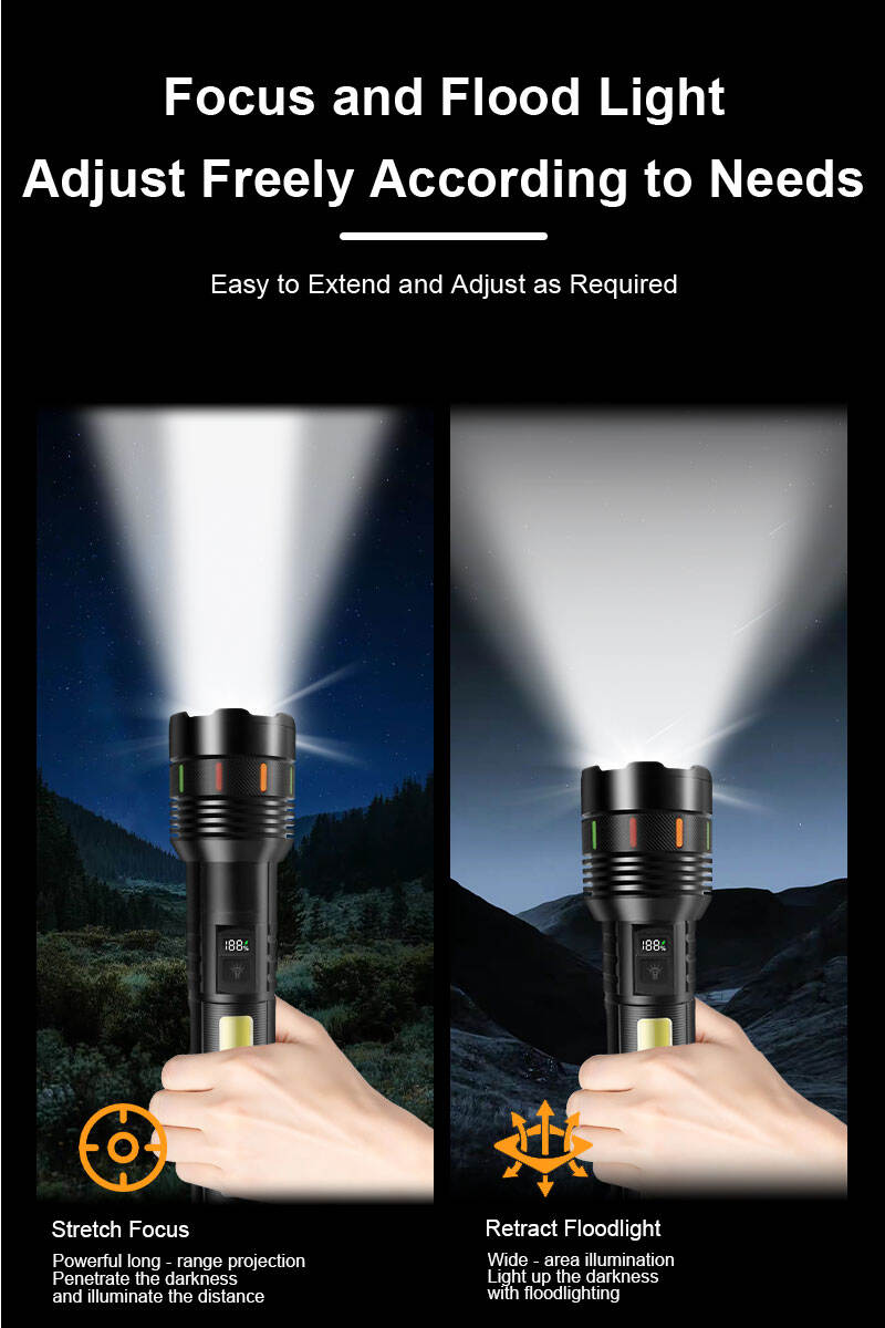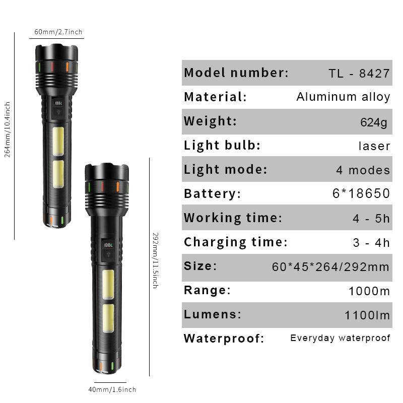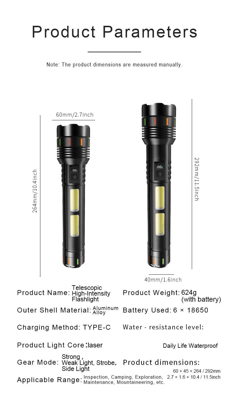 Esta linterna láser de alta potencia está diseñada para usuarios que exigen un brillo extremo, una larga duración de la batería y un rendimiento fiable en entornos exteriores e industriales exigentes. Alimentada por 6 baterías de litio de alta capacidad tipo 18650, ofrece una iluminación potente y estable con un tiempo de funcionamiento prolongado, lo que la convierte en ideal para búsquedas a larga distancia y aplicaciones profesionales. La avanzada fuente de luz láser de 30 W proporciona un haz intenso con excelente penetración y visibilidad a larga distancia, mientras que la función de zoom ajustable permite una transición suave entre modo foco y modo luz difusa para satisfacer distintas necesidades de iluminación. La pantalla digital integrada de potencia permite a los usuarios supervisar claramente el estado de la batería, garantizando una gestión eficiente de la energía durante su uso. Diseñada con un cuerpo robusto de aleación de aluminio, la linterna ofrece una elevada resistencia a los impactos, una disipación térmica eficiente y una larga vida útil, incluso en condiciones adversas. También incorpora una moderna interfaz de carga USB Tipo-C para una carga rápida y estable, además de una práctica función de banco de energía que permite la carga de emergencia de teléfonos móviles y otros dispositivos electrónicos. El diseño de tira luminosa facilita la localización de la linterna en entornos oscuros, mejorando su usabilidad y seguridad. Gracias a su aspecto profesional, su rendimiento multifuncional y su excelente relación calidad-precio, esta linterna constituye una excelente opción para búsquedas al aire libre, patrullajes de seguridad, acampadas, caza, rescate de emergencia e inspección industrial. Está disponible personalización OEM y el producto cumple con las normas CE y ROHS, lo que lo hace apto para mercados internacionales.