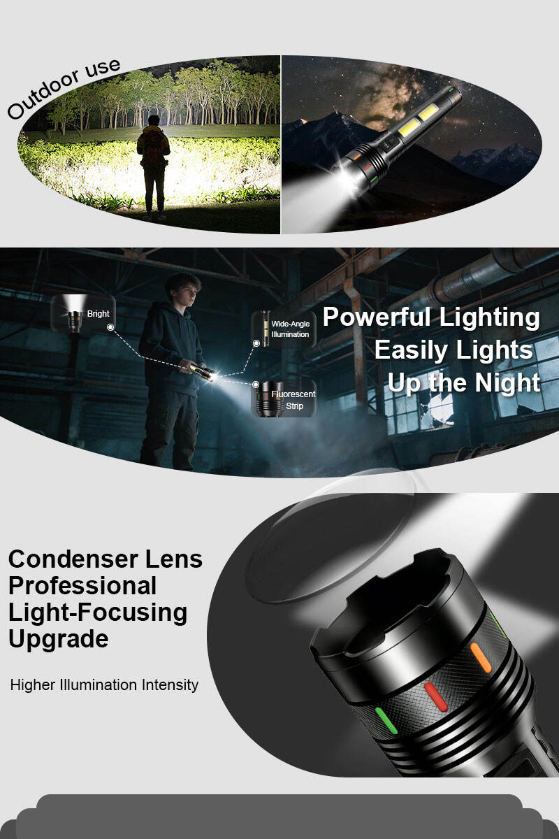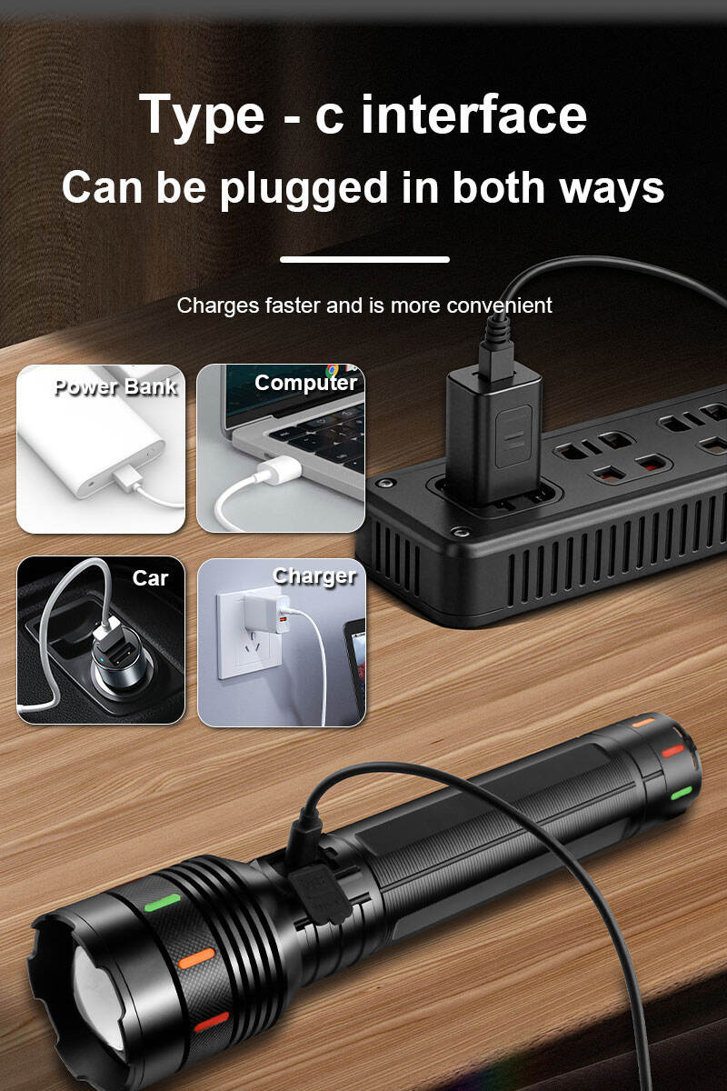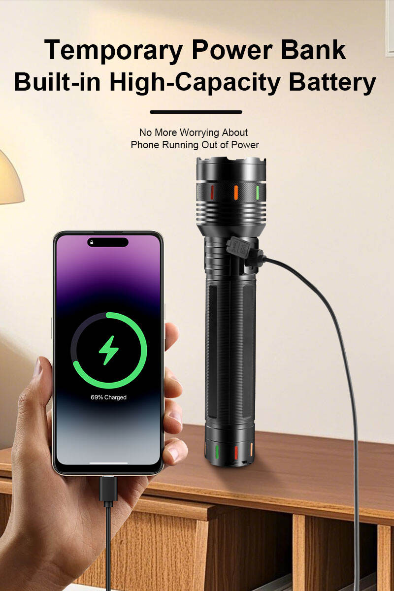 Haz ultrabrillante de larga distancia | Función de banco de energía | Carga rápida mediante conector Tipo-C | Enfoque ajustable | Cuerpo robusto de aleación de aluminio | Linterna profesional para búsqueda al aire libre