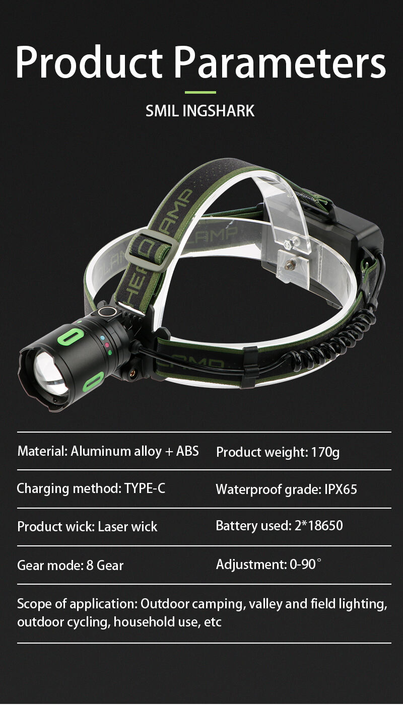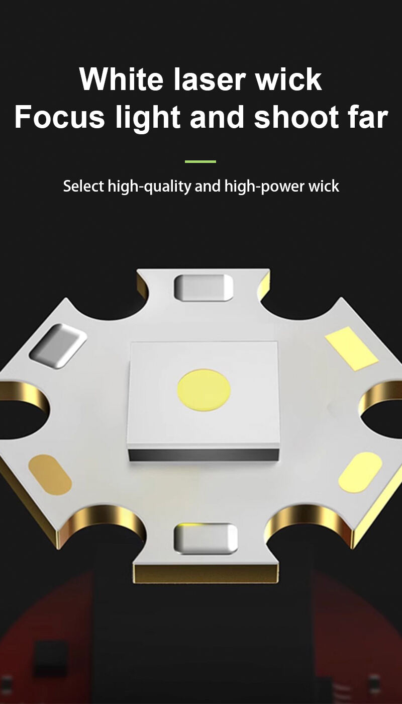Esta lámpara frontal recargable está diseñada con un versátil sistema de triple luz, que combina un haz láser principal, luz cálida SMD y luz COB, para satisfacer diversas necesidades de iluminación en exteriores y en el trabajo. La luz principal integra un haz láser con salida de luz cálida SMD y admite modos alto, bajo y estroboscópico, ofreciendo tanto iluminación enfocada a larga distancia como una iluminación cercana cómoda.