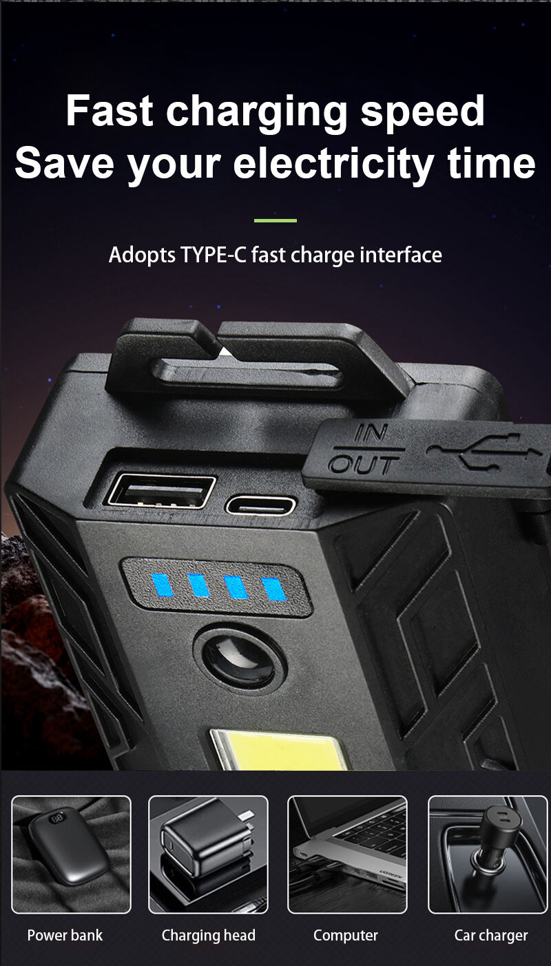 Para un uso prolongado en exteriores, la linterna frontal incluye una función de banco de energía integrado, lo que permite cargar dispositivos móviles cuando sea necesario. Un indicador de potencia muestra claramente el nivel de batería restante, ayudando a los usuarios a gestionar eficientemente el tiempo de funcionamiento. El diseño con tira fosforescente permite que la linterna emita luz en la oscuridad tras haber estado expuesta a la luz, facilitando su localización por la noche.