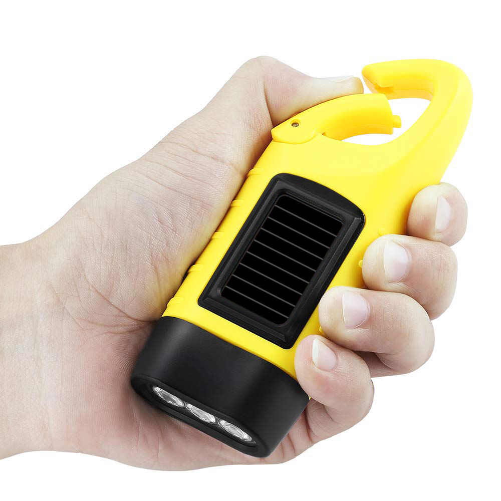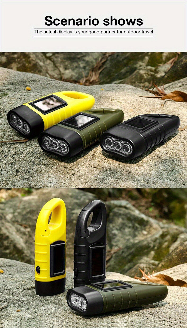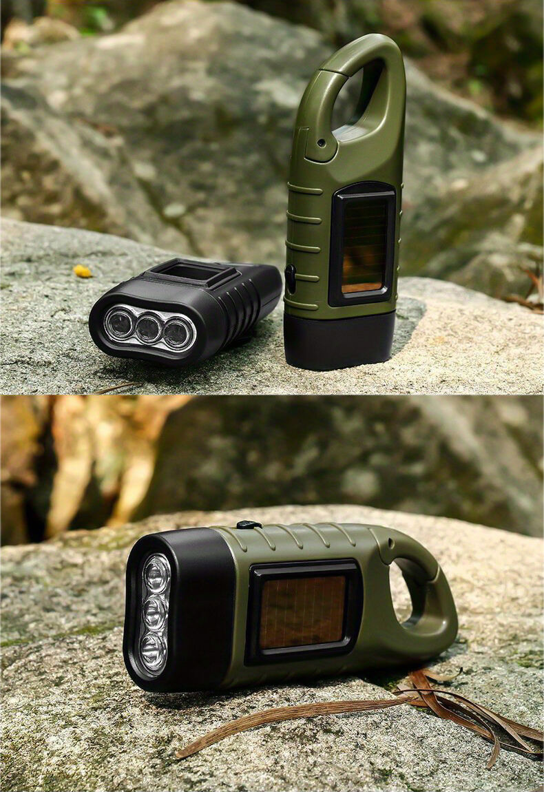 Linterna compacta alimentada por energía solar y recargable mediante manivela manual, con 3 LED brillantes, ideal para iluminación de emergencia, acampada, actividades al aire libre y cortes de energía.