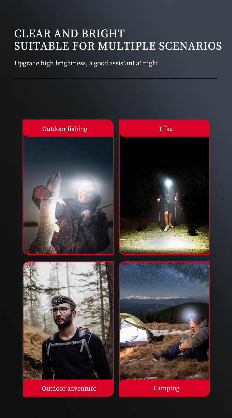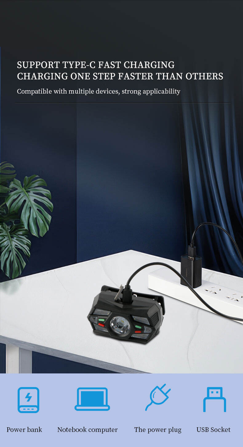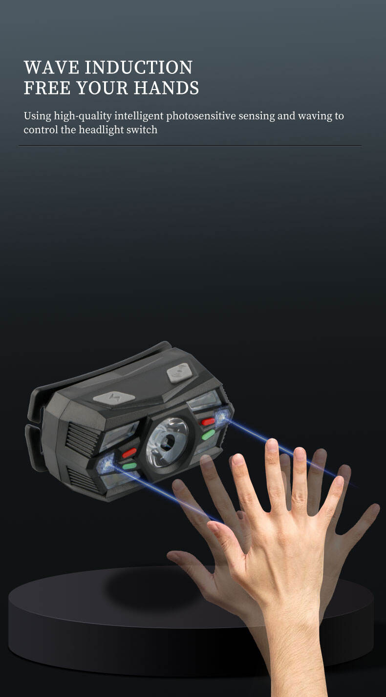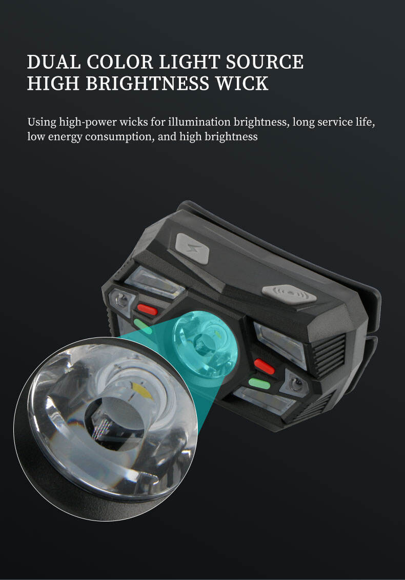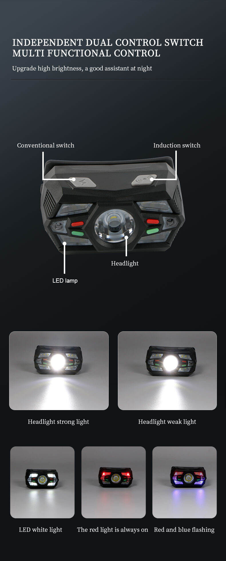 Tämä uudelleenladattava LED-päävalo on suunniteltu sisältäen sisäänrakennetun käsimotiontunnistimen, joka mahdollistaa valon helppon kytkemisen päälle tai pois päältä yksinkertaisella käsien heilautuksella käyttäjän käsiä vapaaksi toiminnan helpottamiseksi. Se yhdistää lumen-päävalon valkoisilla, punaisilla ja sinisillä SMD-LED-valoilla, tarjoaen useita valaistustapoja, kuten korkean ja alhaisen kirkkauden, valkoisen valon, punaisen valon sekä punaisen ja sinisen vilkkuvan valon merkintä- ja hätätilanteita varten. Sisäänrakennettu fosforijuova parantaa näkyvyyttä heikossa valaistuksessa, mikä lisää turvallisuutta ja tekee päävalosta helppolöydettävän yöllä. Päävalo toimii sisäänrakennetulla 18650-uudelleenladattavalla akulla ja tuottaa enintään 200 lumenin kirkkauden jopa 6 tunnin käyttöajalla; se tukee myös nopeaa Type-C-latausta. Keveän muovikoteloisen rakenteen ja mukavan istuvuuden ansiosta tämä päävalo on ideaalinen leiriytykseen, retkeilyyn, yöjuoksuun, huoltotyöhön, ulkoiluun ja hätätilanteisiin.