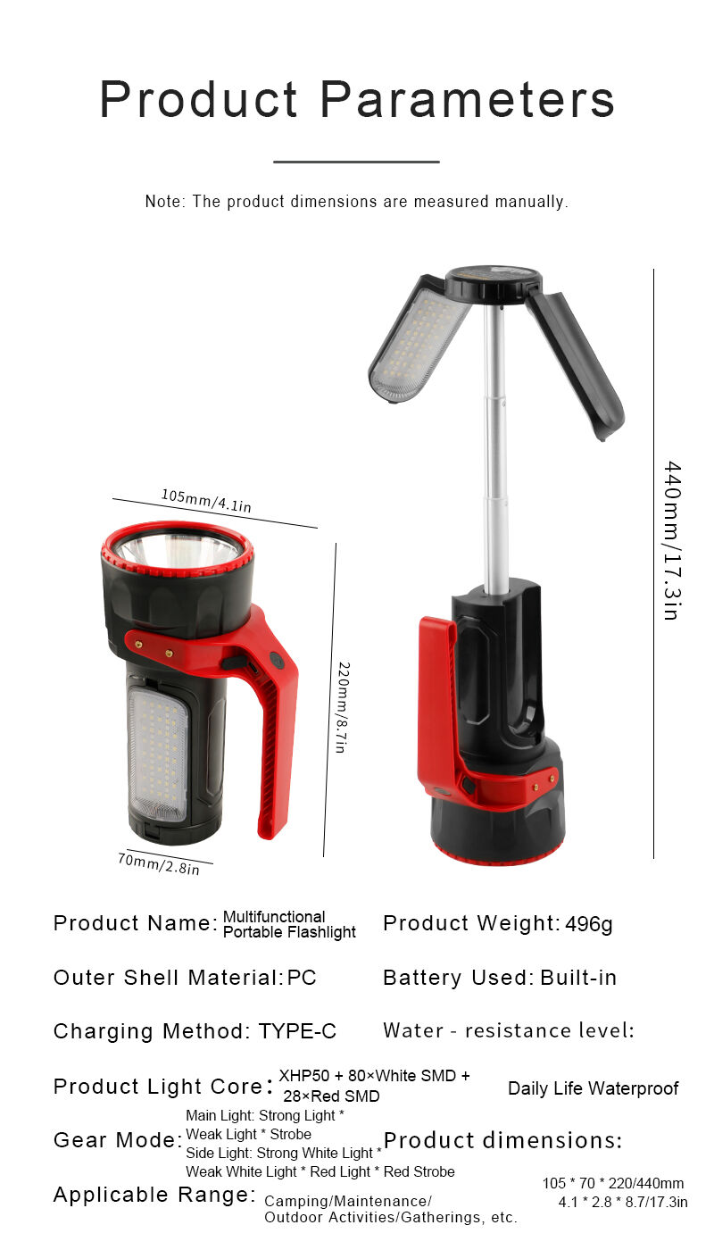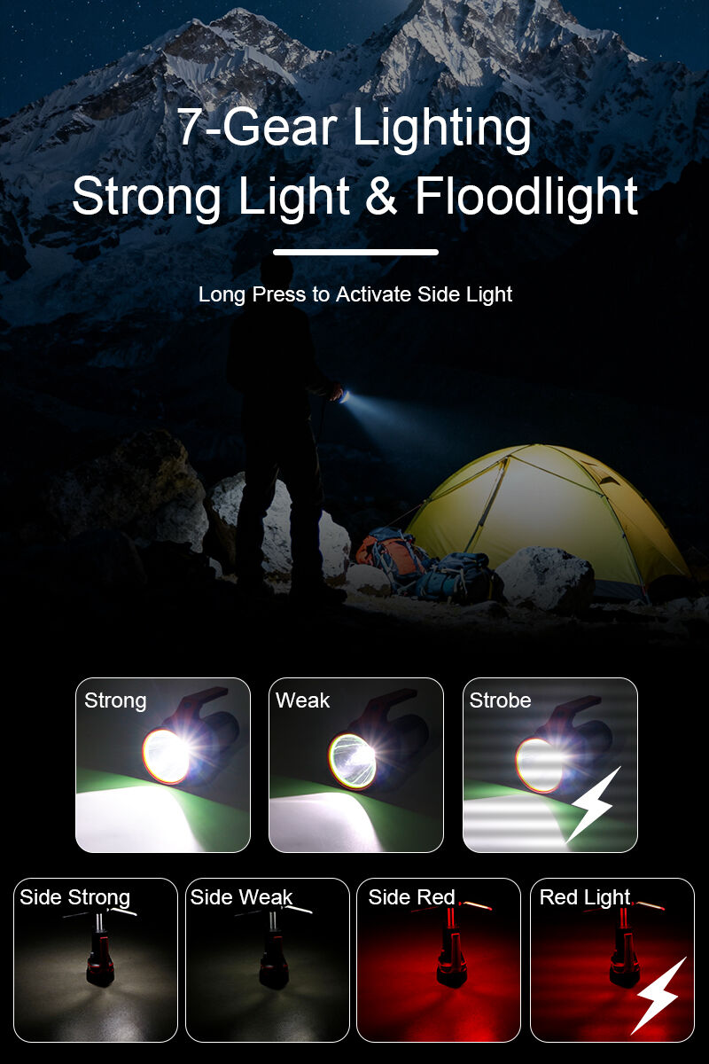 Tämä uudelleenladattava retkeilyvalo on suunniteltu ulkoiluun, leiriytymiseen ja hätävalaistukseen käytettäväksi. Se on valmistettu kestävästä muovikotelosta, jossa on musta pohja sekä punaiset ja vihreät korostevärit parantamaan näkyvyyttä ulkoympäristössä. Teleskooppisella pidikkeellä varustettuna valoa voidaan venyttää ja säätää korkeussa tarjoamaan laajemman valaistusalueen, mikä tekee siitä sopivan tenteissä, leirintäpaikoilla ja ulkoisten työskentelyalueiden käytössä. Tuote sisältää tehokkaan XHP50-pää-LEDin sekä 80 valkoista SMD-LEDiä ja 28 punaista SMD-LEDiä, tarjoten useita valaistustiloja, kuten XHP50:n voimakas, heikko ja vilkkuvat tilat sekä valkoisten SMD-LEDien voimakkaat ja heikot tilat, punainen SMD-valo ja punainen vilkkuvatoiminto varoitus- ja hätämerkkejä varten. Sisäänrakennettua uudelleenladattavaa akkua tukee selkeä digitaalinen virtanäyttö, joka mahdollistaa akun varausasteen helposti seurattavaksi. USB Type-C -lataus takaa helpon ja tehokkaan lataamisen. Korkean kirkkauden, säädettävän rakenteen ja monipuolisten valaistustilojen ansiosta tämä retkeilyvalo on erinomainen käytettäväksi leiriytymisessä, vaelluksessa, muissa ulko-olosuhteissa, yötyössä, hätävarusteissa sekä varavalona.