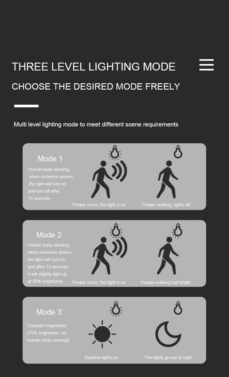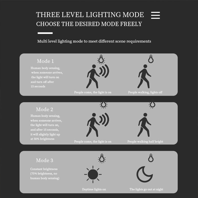 Tämä aurinkoenergialla toimiva seinävalo on varustettu sisäänrakennetulla PIR-liiketunnistimella, joka reagoi automaattisesti ihmisen liikkeisiin ja tarjoaa älykästä ja energiatehokasta ulkovalaistusta. Se sisältää 70 korkean kirkkauden SMD-LED-valodiodia ja tarjoaa kolme käytännöllistä valaistustilaa: valo sammuu henkilön poistuttua, valo himmenee henkilön poistuttua ja valo pysyy aina päällä, mikä mahdollistaa käyttäjän valitsemaan sopivimman tilan eri ympäristöihin. Valo on varustettu integroidulla 1200 mAh:n akulla, joka tukee sekä aurinkolatausta että Type-C -latausta joustavan ja luotettavan virransyötön varmistamiseksi. Kestävä muovikuoret ja kätevä kiinnitysleuka mahdollistavat helpon asennuksen ilman monimutkaisia sähköliitäntöjä, mikä tekee siitä ideaalin ratkaisun puutarhoihin, pihoihin, aitoihin, parvekkeisiin, polkuun ja ulkoisen turvavalaistuksen käyttöön.