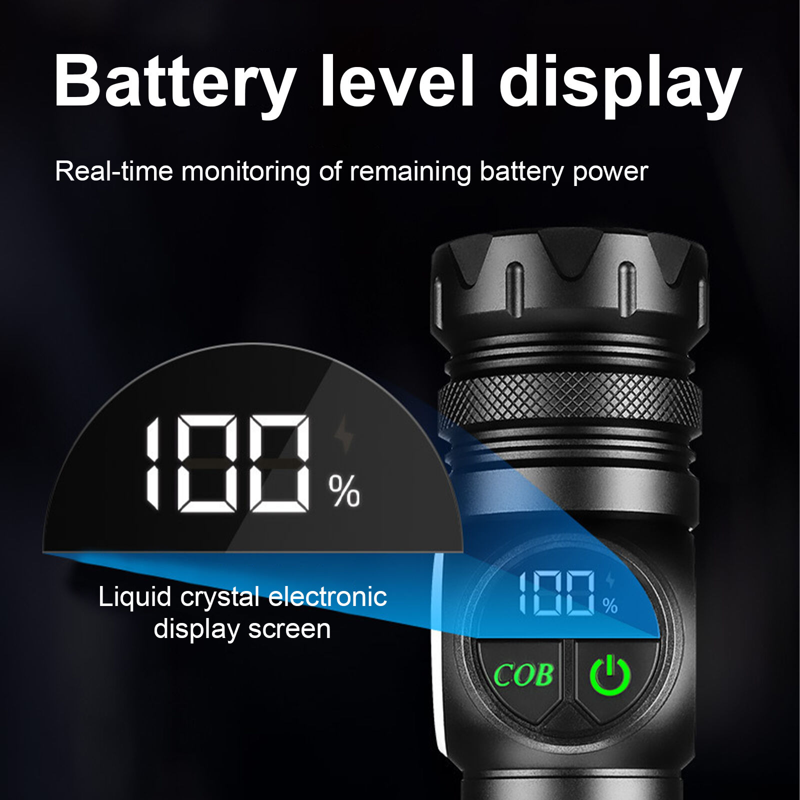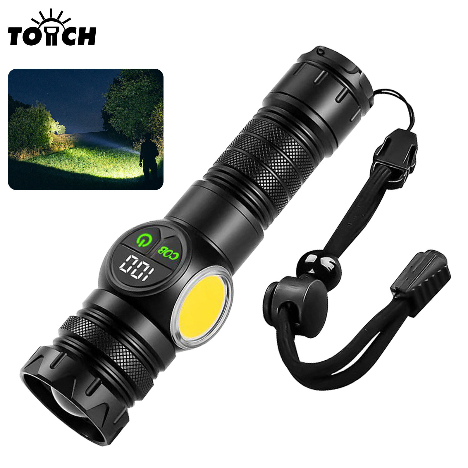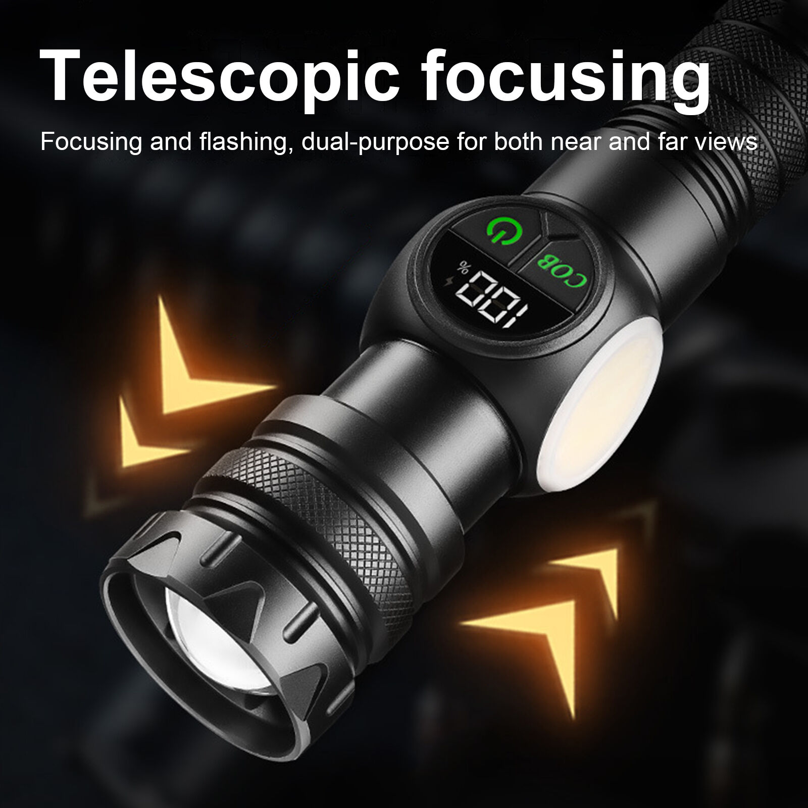 Senter multifungsi dengan lampu laser dan COB, tampilan daya digital, serta alas magnetik kuat