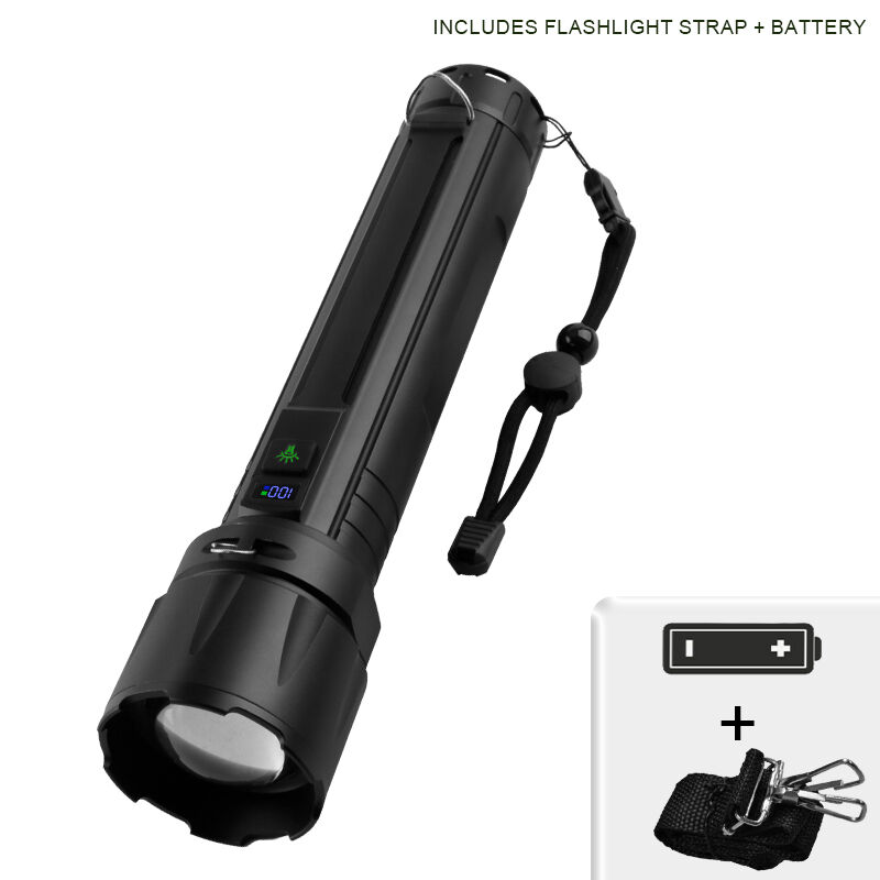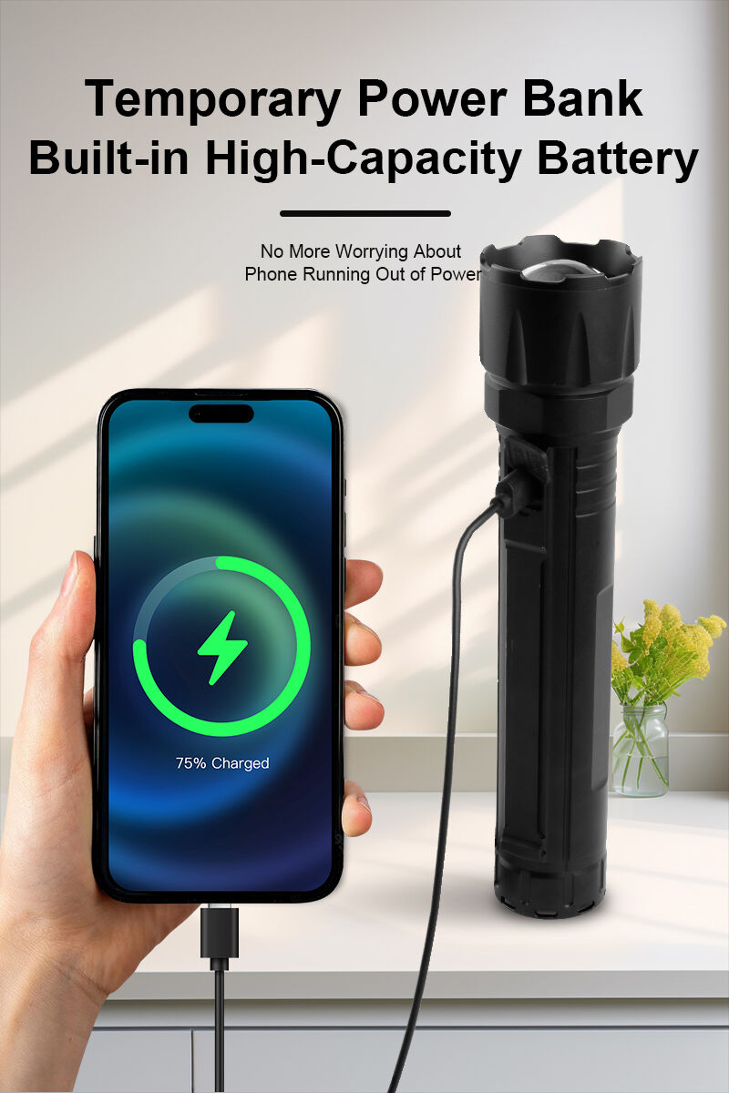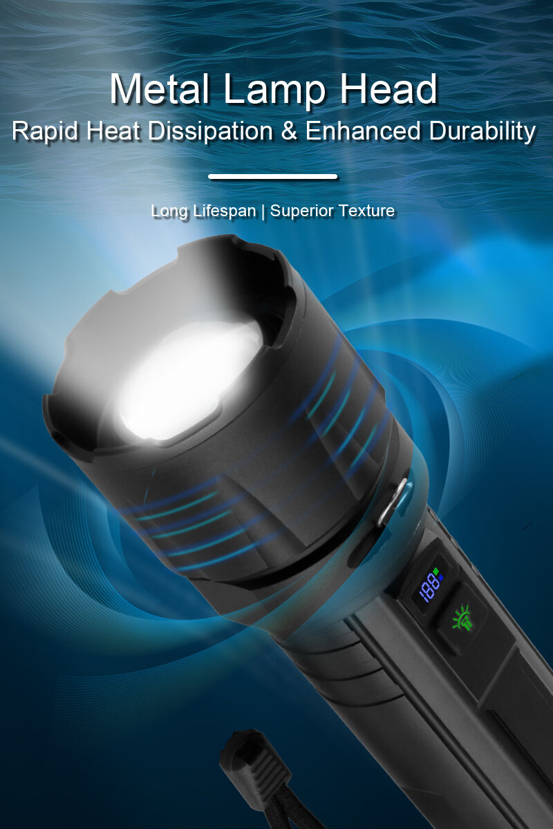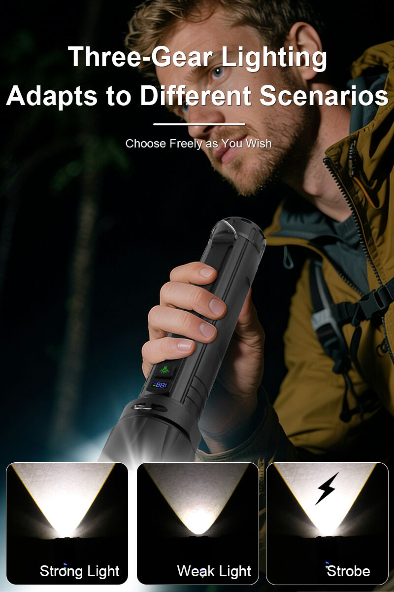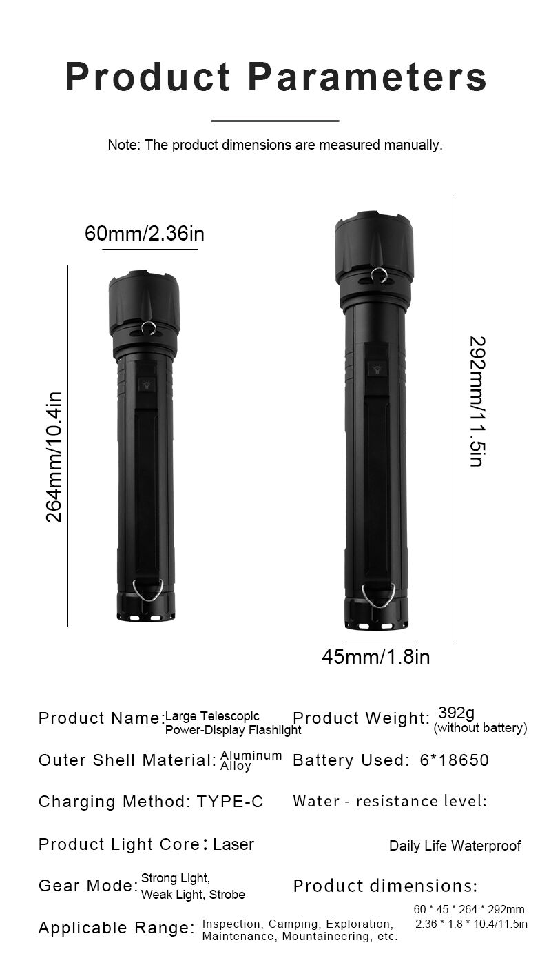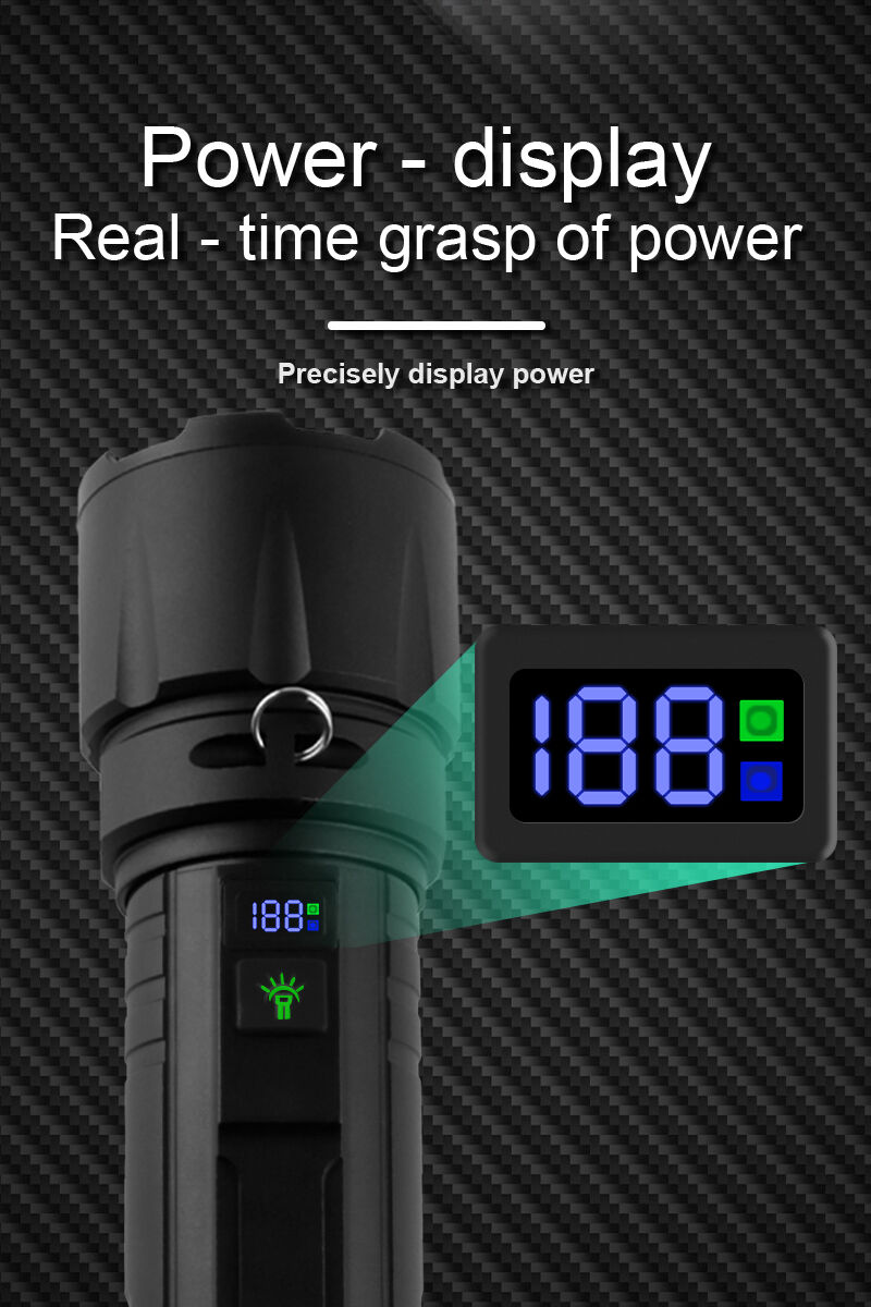 이 고파워 충전식 손전등은 전문가용, 야외 및 비상 조명 용도에 적합하도록 설계되었으며, 견고한 알루미늄 합금 본체를 채택하여 장기간 사용 시 우수한 내구성과 열분산 성능을 제공합니다. 레이저 광원을 장착하여 높은 밝기, 낮은 밝기, 스트로브 조명 모드를 제공하여 다양한 조명 및 신호 전달 요구 사항을 충족합니다. 손전등은 줌 기능을 지원하여 사용자가 빔의 초점을 스팟에서 플러드까지 조절할 수 있어 다양한 환경에서 유연하게 사용할 수 있습니다. 18650 배터리 6개를 사용하도록 설계되어 강력한 출력과 긴 작동 시간을 제공하며, 디지털 전력량 표시 기능을 통해 사용자는 작동 중 전력 상태를 명확하게 확인할 수 있습니다. 내장된 파워뱅크 기능을 갖추고 있어 필요 시 다른 전자기기를 충전하는 데도 사용 가능합니다. USB Type-C 충전을 지원하는 이 손전등은 야외 활동, 보안 순찰, 점검, 구조 작업, 캠핑 등 전문적이거나 중강도 작업용 애플리케이션에 적합합니다.