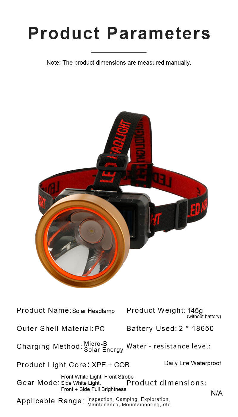 이 태양광 충전식 LED 헤드램프는 야외 활동 및 작업 환경에서 신뢰성 높은 조명을 제공하도록 설계되었습니다. 전력 공급이 제한된 야외 상황에 특히 적합하도록 태양광 충전 및 USB-C 충전 방식을 모두 지원 하며, 다양한 사용 상황에 따라 유연하게 전원을 선택할 수 있습니다. 헤드램프는 XPE 및 COB 이중 광원 을 탑재하여 집중 조명과 광역 조명을 동시에 제공합니다. XPE 고출력/저출력 모드, COB 모드, 복합 조명 모드 등 다중 조명 모드를 제공하여 사용자가 필요에 따라 쉽게 전환할 수 있습니다. 전원은 두 개의 18650 배터리(별도 구매)로 구동 이는 연장된 작동 시간과 안정적인 성능을 보장합니다. 현대적인 블랙 및 골드 컬러 조합의 경량 플라스틱 하우징은 내구성과 편안함을 제공하여 캠핑, 하이킹, 야간 작업, 정비 및 비상 상황에 이상적입니다.