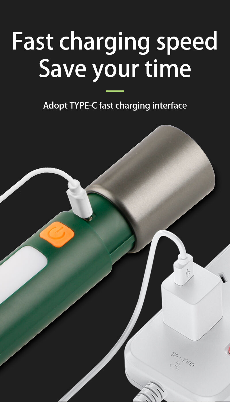 태양광 및 타입-C 충전 지원 줌 손전등 | 레이저 + 흰색 SMD 광원, 야외 및 비상 상황용 멀티모드