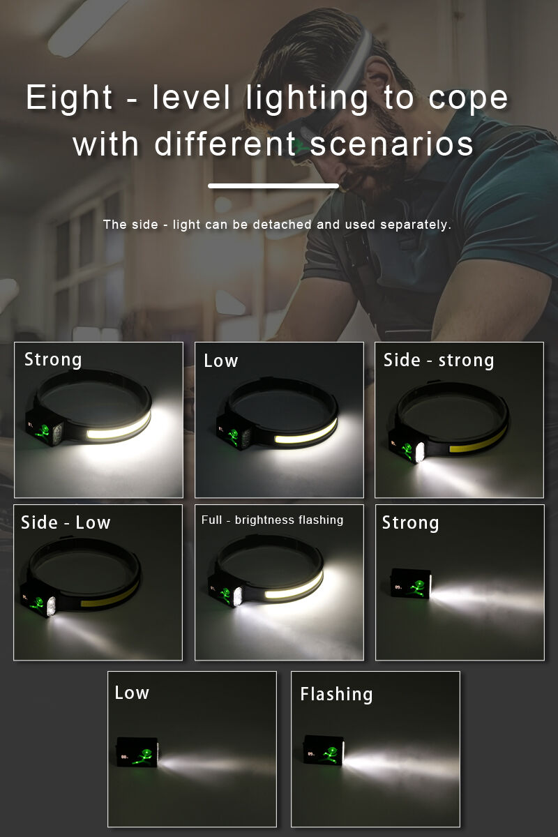 Этот перезаряжаемый фонарь-головник предназначен для использования на открытом воздухе, на рабочих местах и в аварийных ситуациях. Он выполнен из прочного пластика и силикона, обеспечивая комфорт при ношении и надежную работу. Фонарь оснащен светодиодом COB и двумя светодиодами XPE, обеспечивая несколько режимов освещения: высокая и низкая яркость COB, высокая и низкая яркость XPE, а также комбинированный стробоскопический режим для различных условий освещения. Встроенный датчик движения руки позволяет легко включать и выключать фонарь простым движением ладони, что особенно удобно при работе в перчатках или при необходимости работать обеими руками. Боковой фонарь можно отделить и использовать отдельно, что добавляет гибкости при ближнем или переносном освещении, а встроенный магнит обеспечивает надежное крепление к металлическим поверхностям. Долгое нажатие на сенсорную кнопку позволяет переключаться между режимом только бокового света и комбинированным режимом освещения. Цифровой индикатор уровня заряда, встроенный перезаряжаемый аккумулятор и подзарядка через USB Type-C обеспечивают четкий контроль за уровнем заряда и удобную подзарядку. Многофункциональная конструкция делает этот фонарь подходящим для кемпинга, походов, ночных работ, технического обслуживания, ремонтных работ, аварийных комплектов и профессионального использования.
